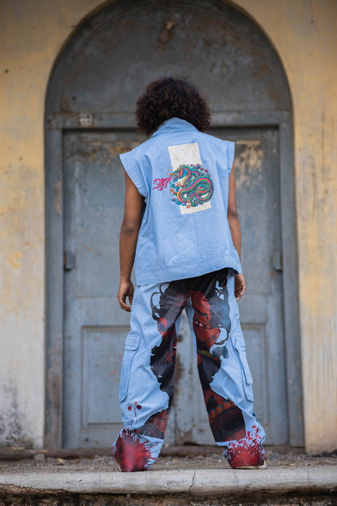 Command attention with this head-turning powder blue co-ord set, crafted in breathable denim. Featuring a sleeveless snap-button vest with a vivid dragon back print and graffiti-style cargo pants with fiery red splash art, this set is built for bold personalities and next-gen streetwear enthusiasts.